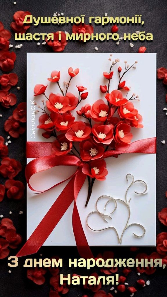 Моя ніжна Наталю, вітаю тебе! Ти робиш моє життя яскравим і повним сенсу. Дякую за кожну усмішку, за кожен погляд, за кожну хвилину, проведену разом. Бажаю, щоб очі завжди сяяли від щастя, а серце — від кохання.