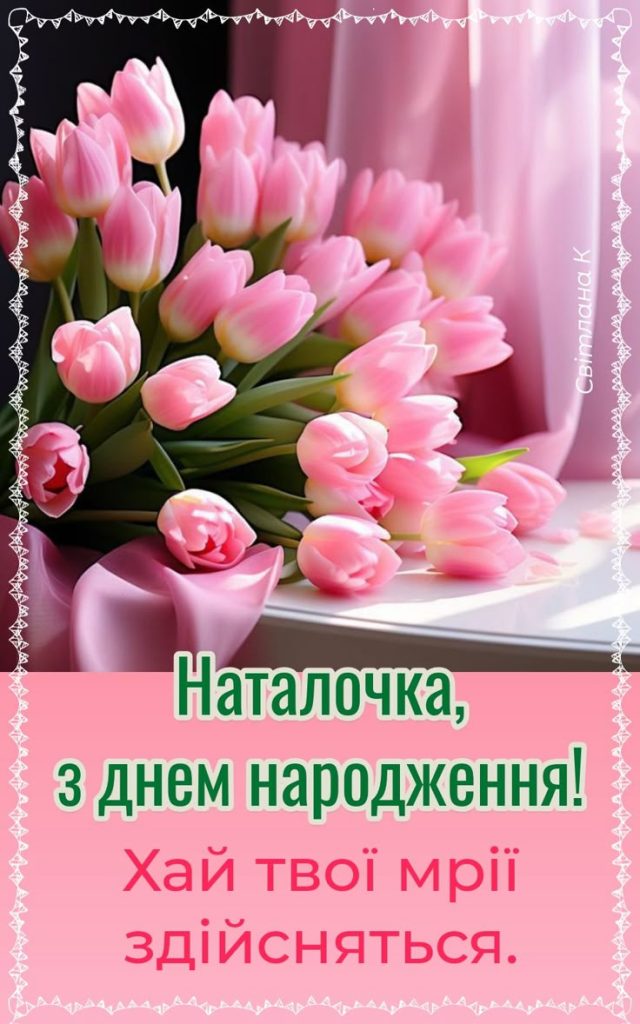 Наталю, вітаю тебе! З тобою ніколи не буває нудно. Ти вмієш перетворити звичайний день на пригоду. Бажаю, щоб усе, про що ти мрієш, збулося. Ти заслуговуєш на найкраще!