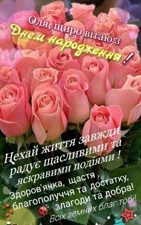 Моя ніжна Олю, вітаю тебе! Ти робиш моє життя яскравим і повним сенсу. Дякую за кожну усмішку, за кожен погляд, за кожну хвилину, проведену разом. Бажаю, щоб очі завжди сяяли від щастя, а серце — від кохання.