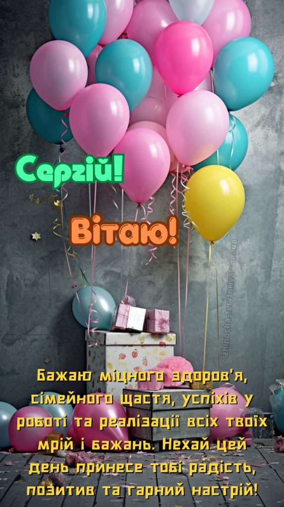 Сергійко, зі святом! У цей особливий день хочу сказати: ти — справжній друг. Таких, як ти, мало. Бажаю бути щасливим — не просто успішним, а саме щасливим у глибині душі. Нехай кожен день буде наповнений сенсом!